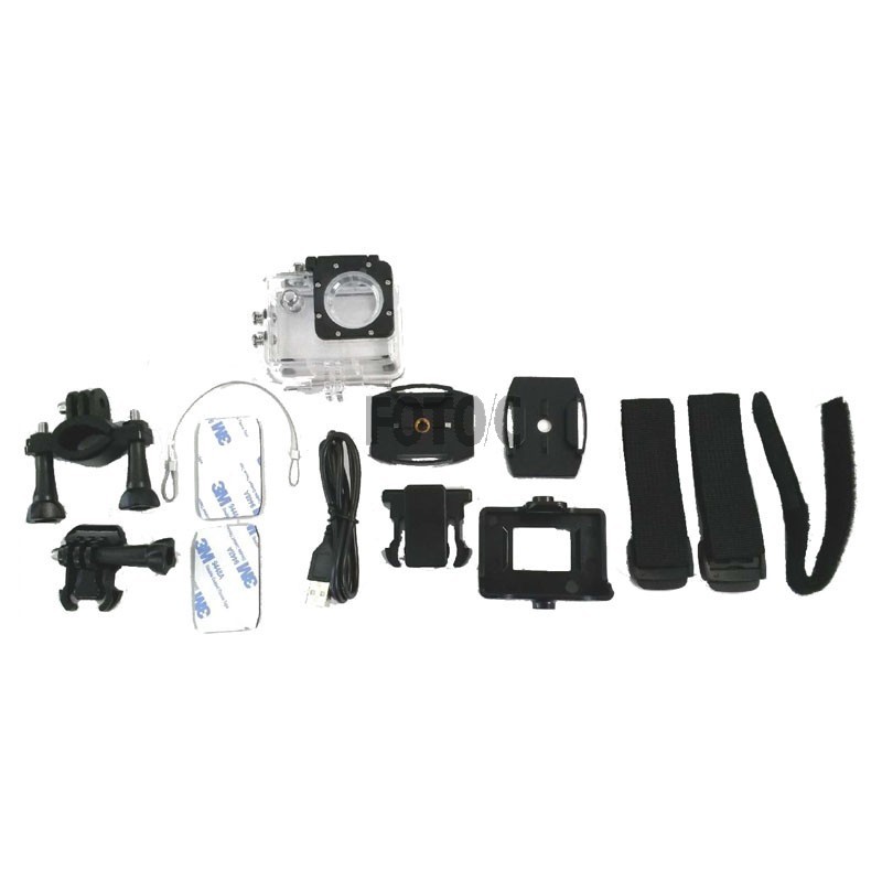 Action cam, batteri, undervandshus (30 meter), Klemme til styr, hjelmmontering og USB kabel
