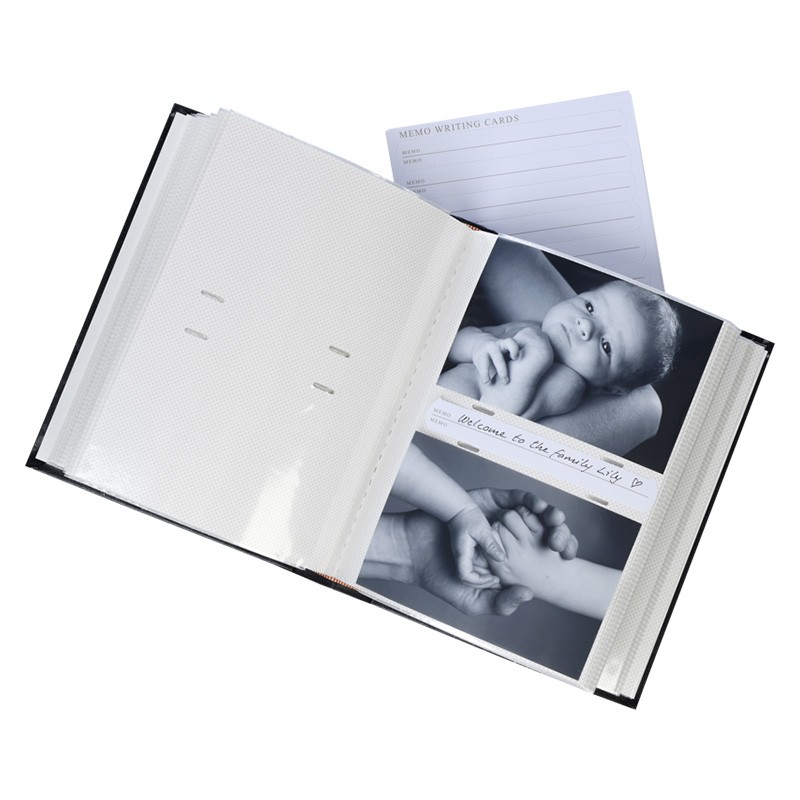 Hver fotolomme har en skriveplads til personlige noter, datoer eller billedtekster. Den indeholder også en lomme til en cd eller et hukommelseskort, så du kan gemme digitale og trykte minder på ét sted.