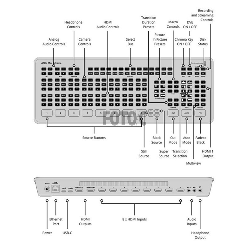 Den kan tilsluttes et almindeligt TV med HDMI indgang og du er klar til at producere live video. Mulighed for picture in picture. På lydsiden er der 2 minijack indgange ligesom lyden fra alle HDMI input også er embedded. Samtidig har Atem Mini Extreme også en hovedtelefon tilslutning så du overvåge dine lydkilder.