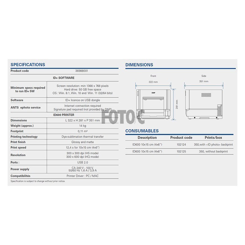 The ID+ photo system swiftly and easily produces all kinds of ID photos, in compliance with EU requirements. It is composed of DNP’s dye sublimation ID 600 Photo Printer and a touchscreen tablet with an integrated camera, embedded with ID+ software.