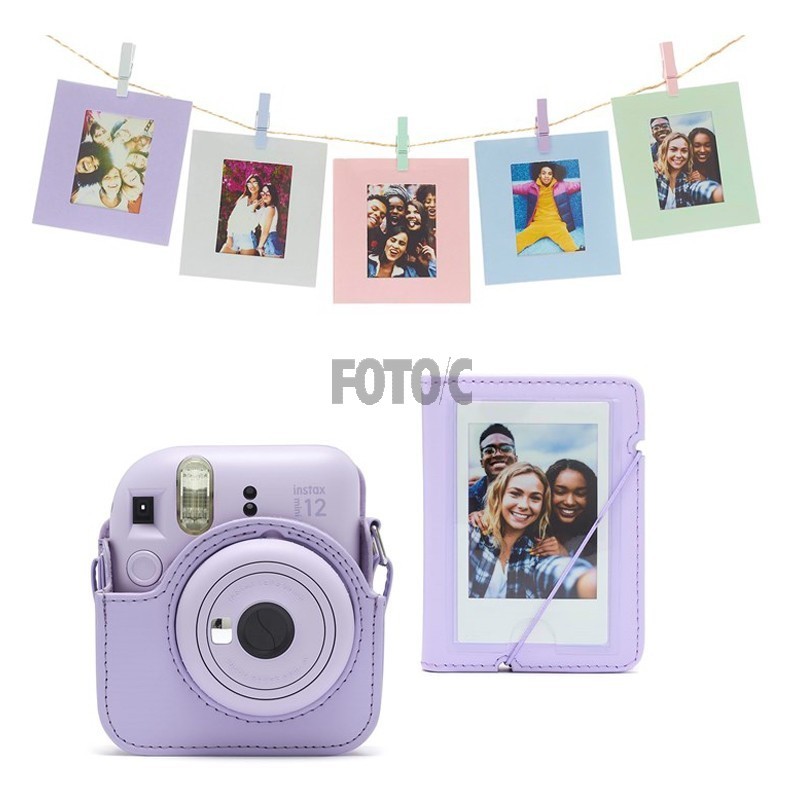 Tilbehørssæt til Instax Mini 12, inkluderer original taske med bærerem, album og 10 fotorammer med clips og snor til ophængning.