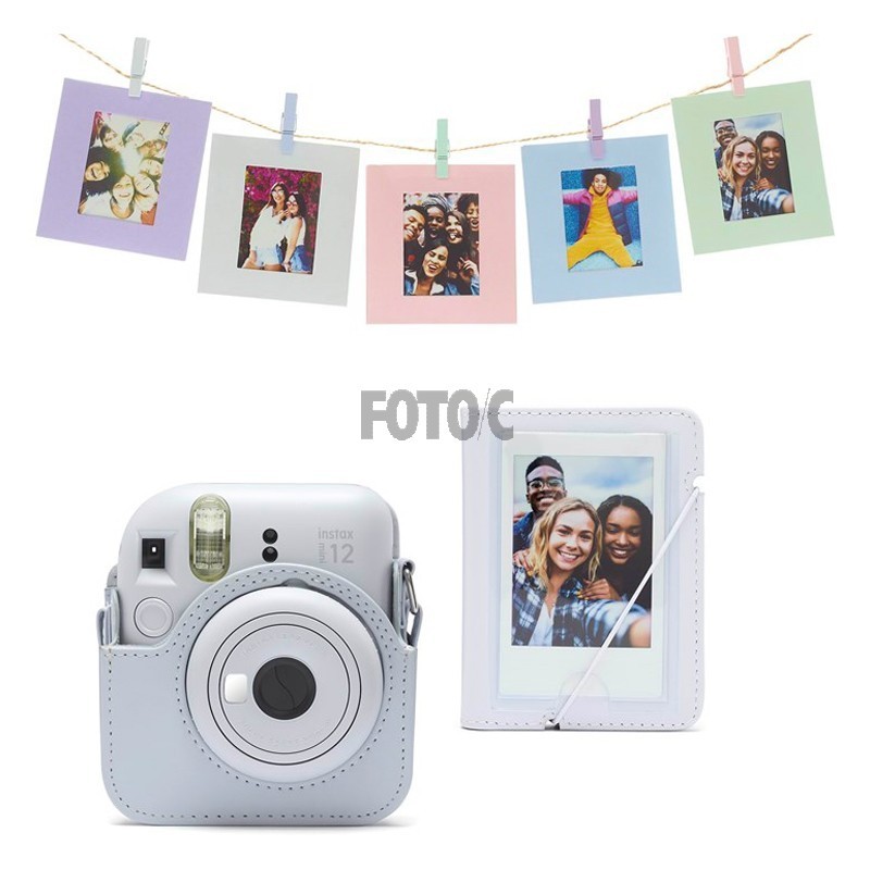 Tilbehørssæt til Instax Mini 12, inkluderer original taske med bærerem, album og 10 fotorammer med clips og snor til ophængning.