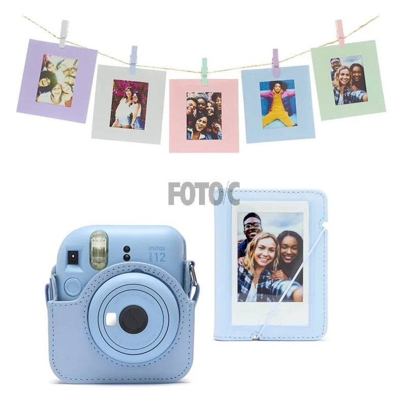 Tilbehørssæt til Instax Mini 12, inkluderer original taske med bærerem, album og 10 fotorammer med clips og snor til ophængning.