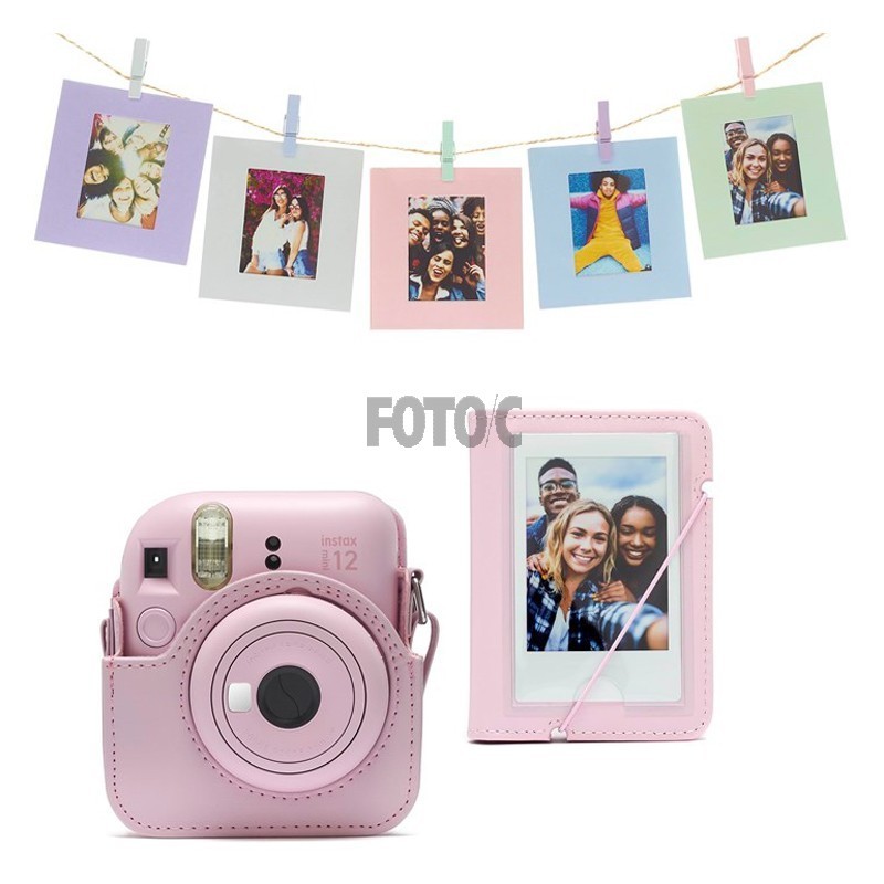 Tilbehørssæt til Instax Mini 12, inkluderer original taske med bærerem, album og 10 fotorammer med clips og snor til ophængning.