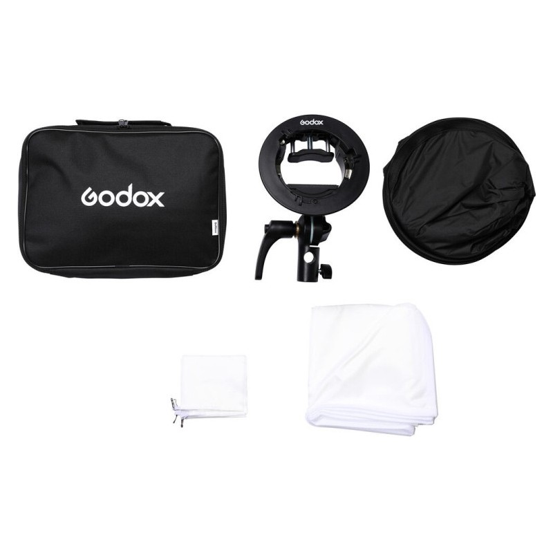 Med produktet følger en 60x60cm sammenklappelig softbox for blød og jævn belysning samt en bæretaske til opbevaring og transport.