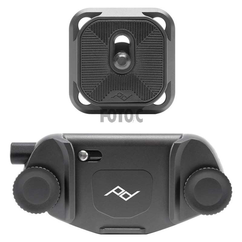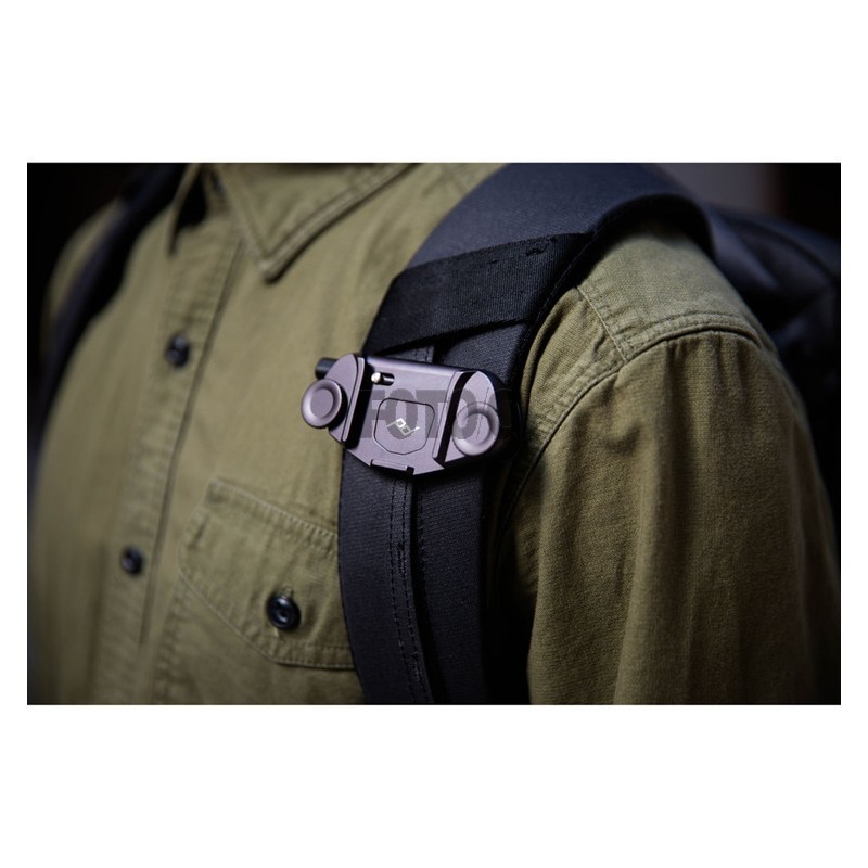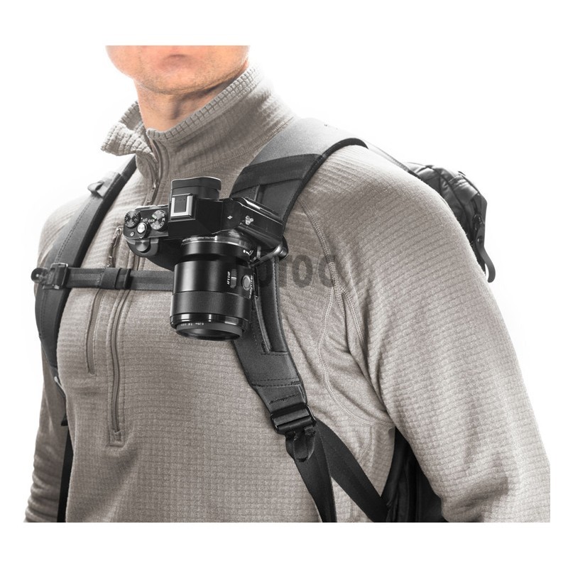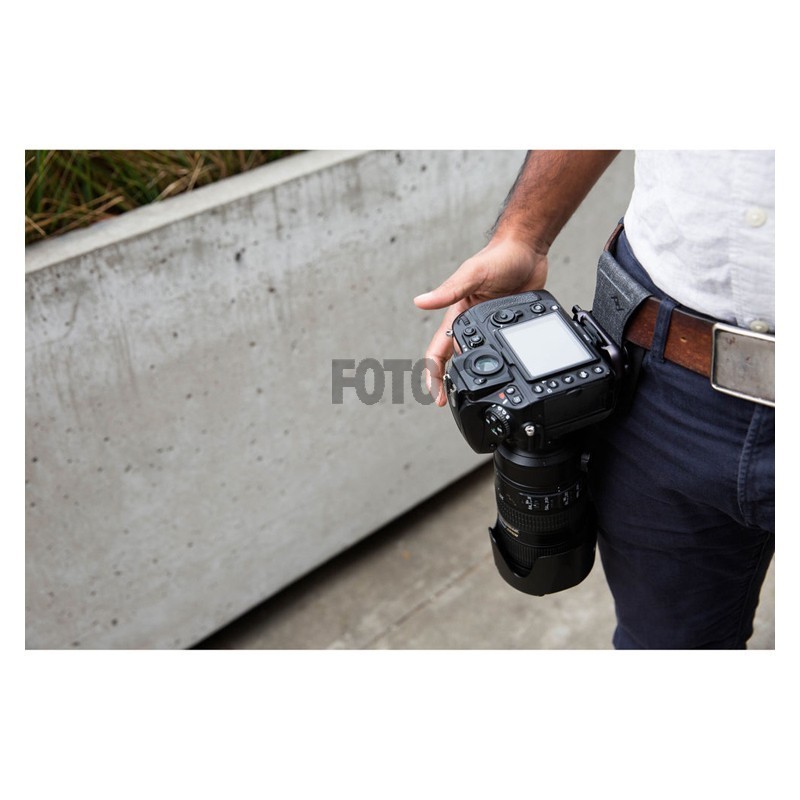 Indeholder 2 komponenter: En metalklemme, der spændes fast til enhver rygsækrem, bælte eller taske, og en Arca-stativkompatibel plade, der skrues fast i bunden af dit kamera. Dit kamera låses fast i clipsen, hvor det holdes fast og sikkert.