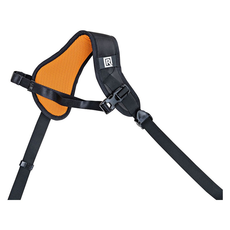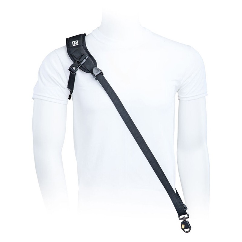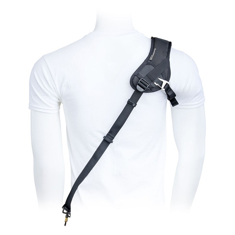 BlackRapid Sport X Left Extra Comfort kameraremmen er designet til at blive båret hen over kroppen på en venstrehåndet bruger – fra højre skulder til venstre hofte. Et tilsluttet kamera hviler på hovedet langs hoften, så det hurtigt kan løftes til brug.
