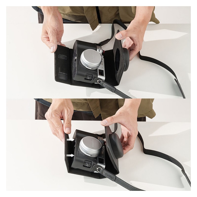 Designet til at beskytte kameraet og objektivet og forbedre kameraets retrofornemmelse og kvalitet. Sættet indeholder et halvt læderetui, et flipcover og en skulderrem.