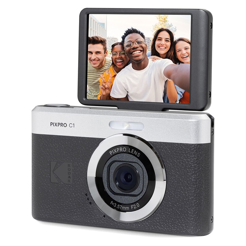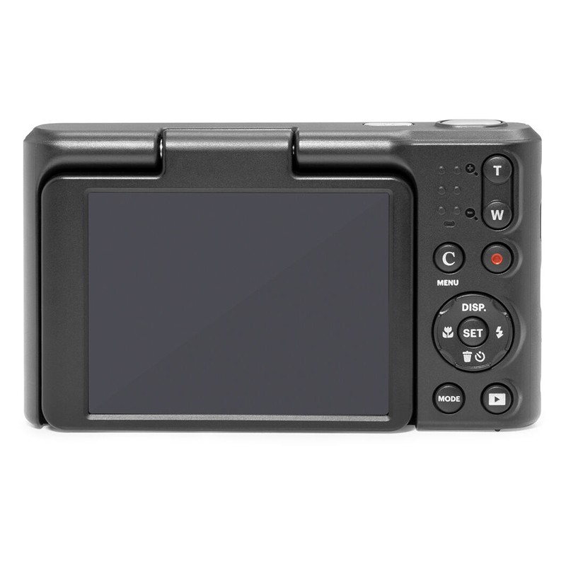 Kameraet har indbygget blitz samt en 2,8" LCD-skærm, der kan vippes 180°, hvilket gør den ideel til selfies eller optagelser fra alle vinkler.
