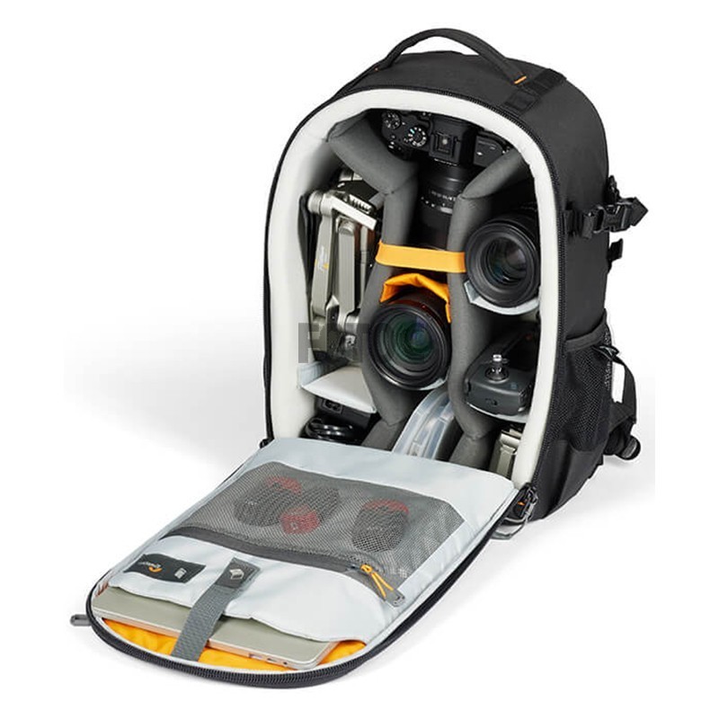BP 300 leverer en solid beskyttelse til dit kamera og objektiver, med en praktisk og nem adgang fra taskens forside hvor der er fleksible ruminddeling. 100% udnyttet plads til udstyr: Der er masser af plads til at organisere og opbevare et komplet sæt af objektiver samt dit kamera, men der er også en 13’’ laptop lomme. De dobbelte sidelommer kan rumme en vandflaske og/eller et stativ. Alternativt, kan stativet også fastsættes på forsiden af rygsækken.