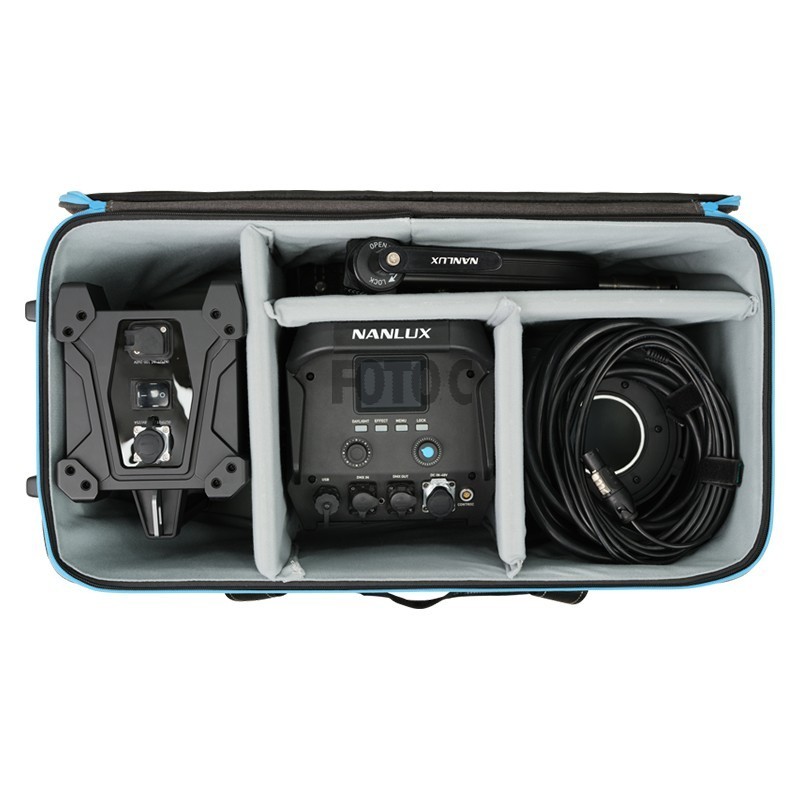 Rullekufferten har hjul og et teleskophåndtag, der gør det nemt at transportere Evoke-lyset til alle scener. Den er også stor nok til at rumme tilbehøret, der følger med Evoke 1200. Kufferten har specialfremstillede, polstrede indvendige rum til opbevaring, der beskytter dit lysudstyr maksimalt