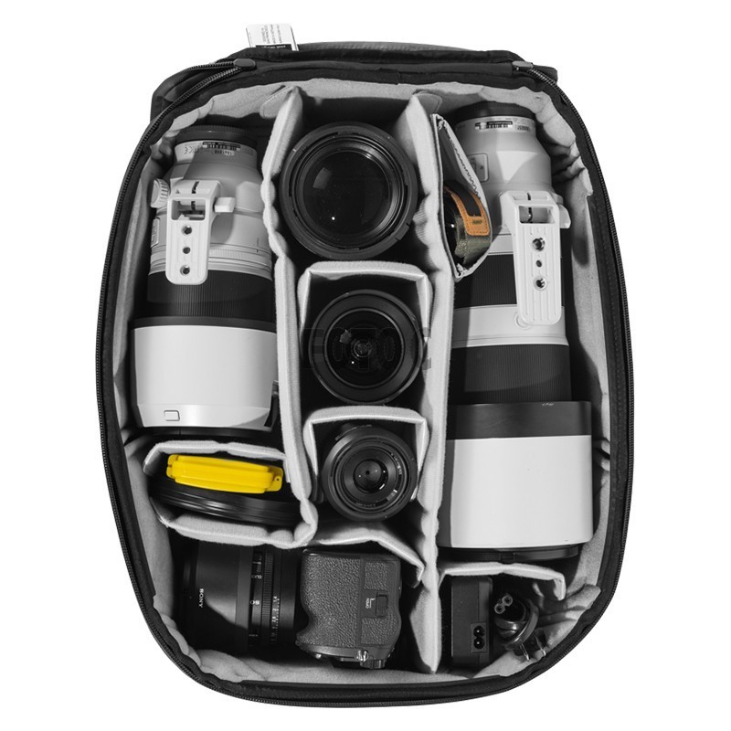 Kan tilpasses FlexFold-opdelere gør det muligt at tilpasse organisering og beskyttelse. Stabl tingene vertikalt for maksimal kapacitet. Flydende lomme til objektivdæksler, filtre og andre småting.