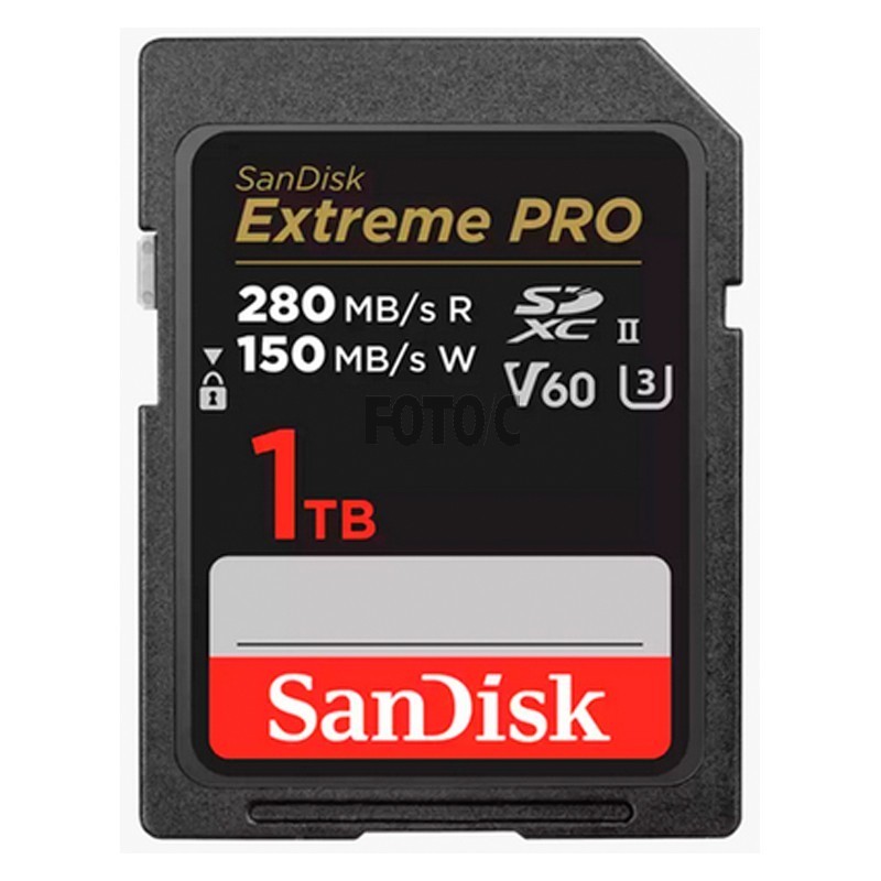SanDisk SDXC-kort med op til 280 MB/s læsehastighed og 150 MB/s skrivehastighed til 6K UHD-videoer.