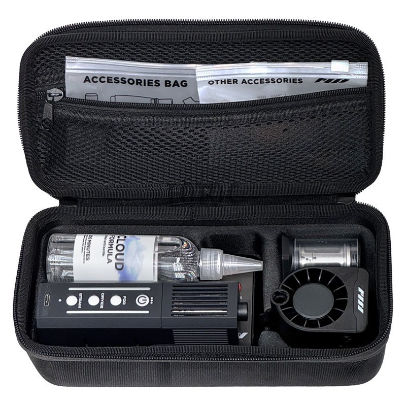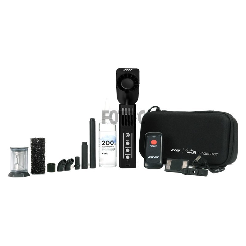 Haze Kit indeholder 3. generation af PMI Haze-ventilatoren med Haze Blending-teknologi, der giver en endnu finere dis end forgængeren. Ventilatoren leveres med 2,4 GHz-parring og et mundstykke til enhåndsbetjening. SmokeNINJA-PRO kan dise et 90 kvadratmeter stort studie på to minutter.