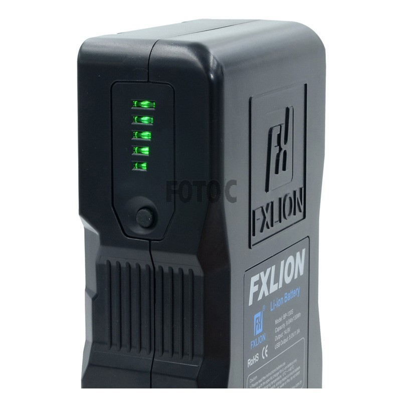 Cool Black-serien af V-lock batterier fra Fxlion har D-tap og USB-A output. Fem streger angiver rest-batteritiden.