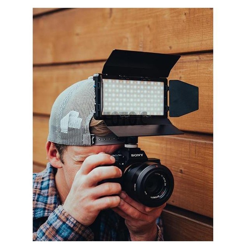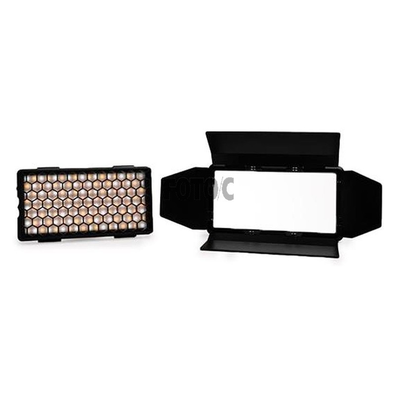 Kit til justering af lyset fra Lume Cube Panel Pro. Sættet indeholder en honeycomb-diffuser og en barndoor.